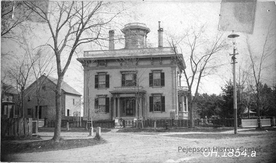 A B/W photograph of Capt. Jordan home, built in 1860. It was moved, in 1874 from 77 Federal Street, around the rear of the adjacent buildings to 85 Federal Street, Brunswick, ME to serve as residence for President Harris of Bowdoin College. Not dated.