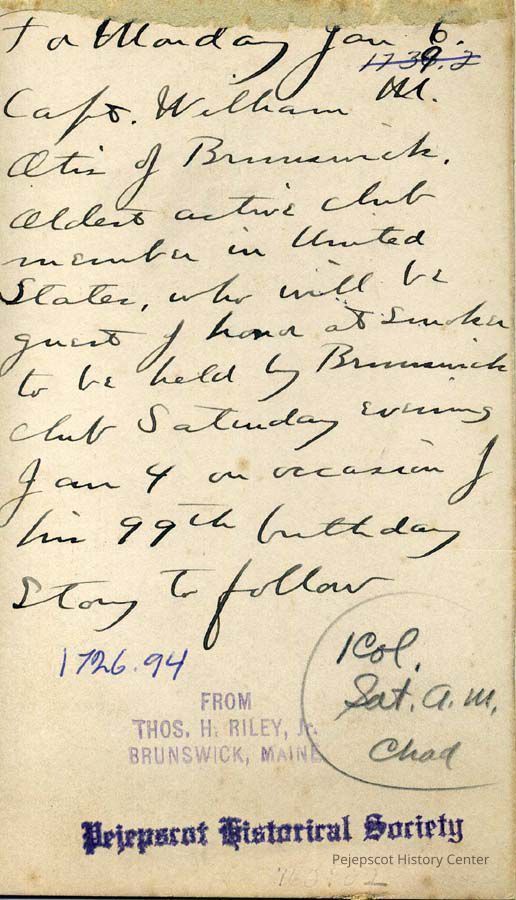 William M. Otis was the son of Capt. James Otis, a veteran of the War of 1812, and his wife, the former Betsey Snow of Great Island, Harpswell. He was the oldest man in Brunswick and the oldest member of United Lodge of Masons, which he joined in 1846. He was a Democrat and a frequent delegate to party conventions.