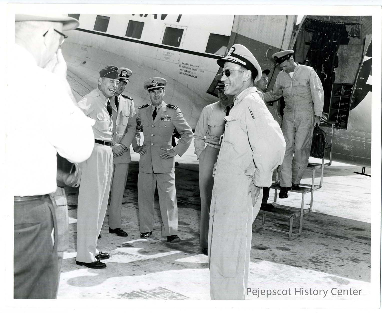A picture of several men in uniform standing beside or disembarking from an airplane. The man in sunglasses is Capt. Yvrosky, squadron commander. Undated
