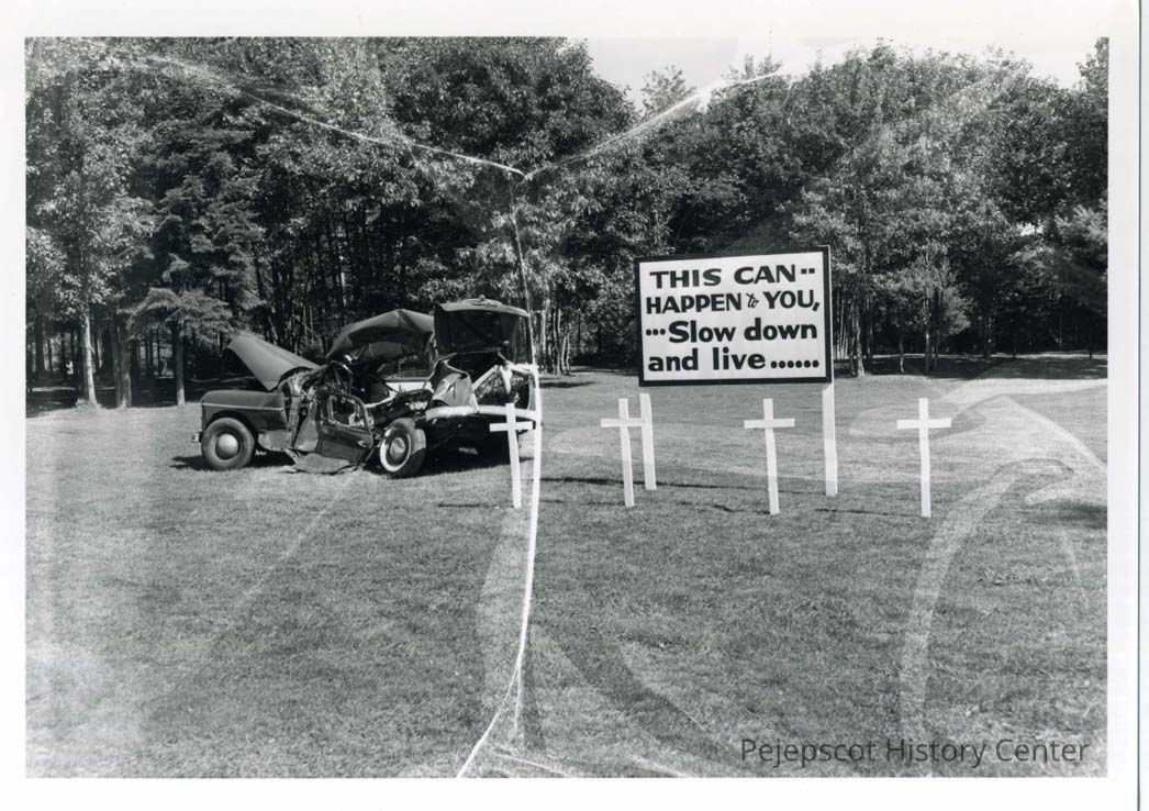 The photo shows a crashed car, four crosses and a sign that reads "THIS CAN HAPPEN TO YOU, Slow down and live." The site commemorates an accident at the intersection of the Augusta and Lewiston roads where four sailors died.