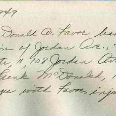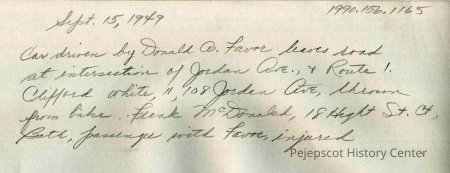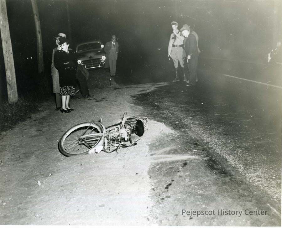 A B/W photograph of a car bike accident. Car driven by Donald Favor left the road at the intersect of Jordan Ave. and Route 1. Clifford White, 11, of Jordan Ave. was thrown from his bike. Frank McDonald of Bath, a passenger with Favor was injured. 9/15/1945.Collection