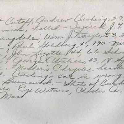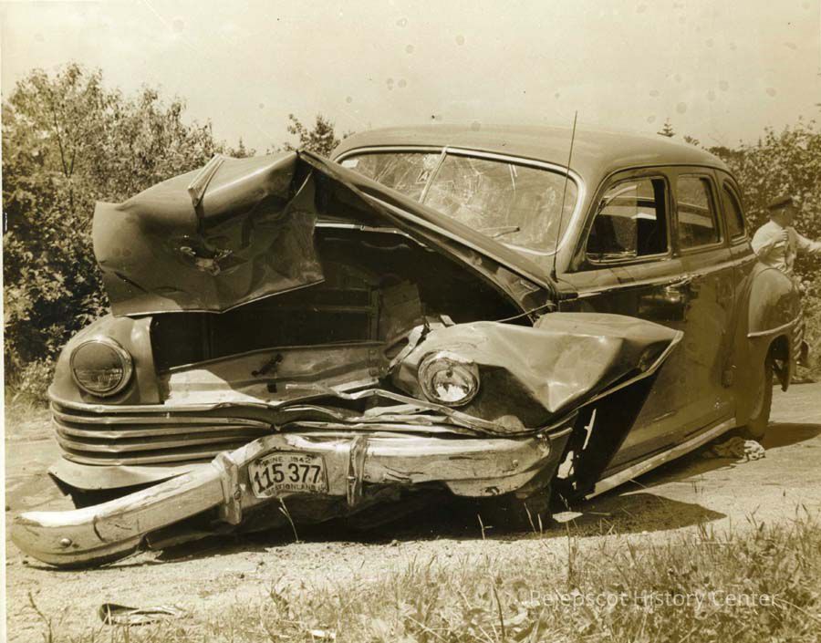 A B/W photograph of a car wreck on the Freeport cutoff. Andrew Cushing's car was in the wrong lane headed towards Brunswick. Eye witness was Charles A. Thomann of Andover, MA. Andrew Cushing, 29, of Brunswick was killed. Those injured were: J T Moser (died); Wm J Daigle; Paul Goldberg; John Lizotte; and George Cloutier, all of Gardiner. 8/22/1955Collection