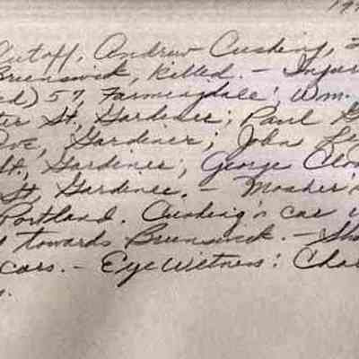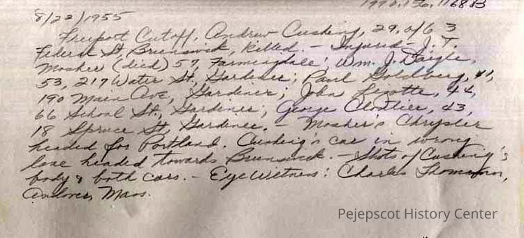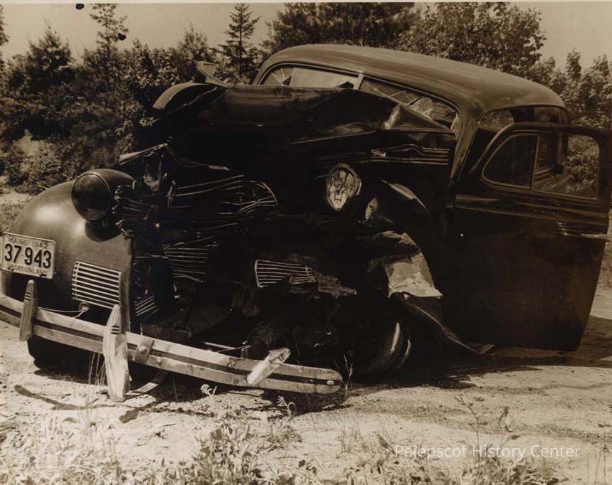 A B/W photograph of a car wreck on the Freeport cutoff. Andrew Cushing's car was in the wrong lane headed towards Brunswick. Eye witness was Charles A. Thomann of Andover, MA. Andrew Cushing, 29, of Brunswick was killed. Those injured were: J T Moser (died); Wm J Daigle; Paul Goldberg; John Lizotte; and George Cloutier, all of Gardiner. 8/22/1955Collection