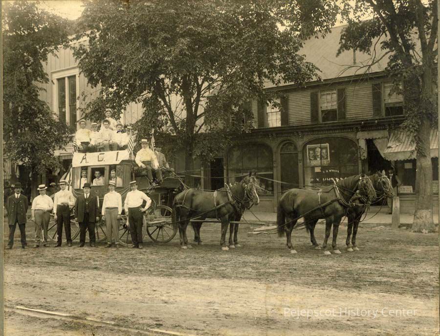 A B/W photograph of a Carriage on Maine Street The photo was taken in front of the Swift Block on the corner of Maine and Mason Streets. The waiting Room for the trolley car can be seen in the background. The people are;