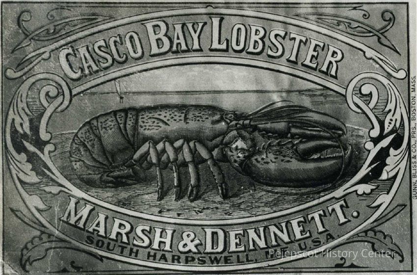 A B/W photographic view of a food can label for, "Casco Bay Lobster" packed by, "Marsh and Dennett". c 1860