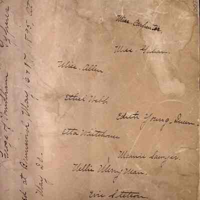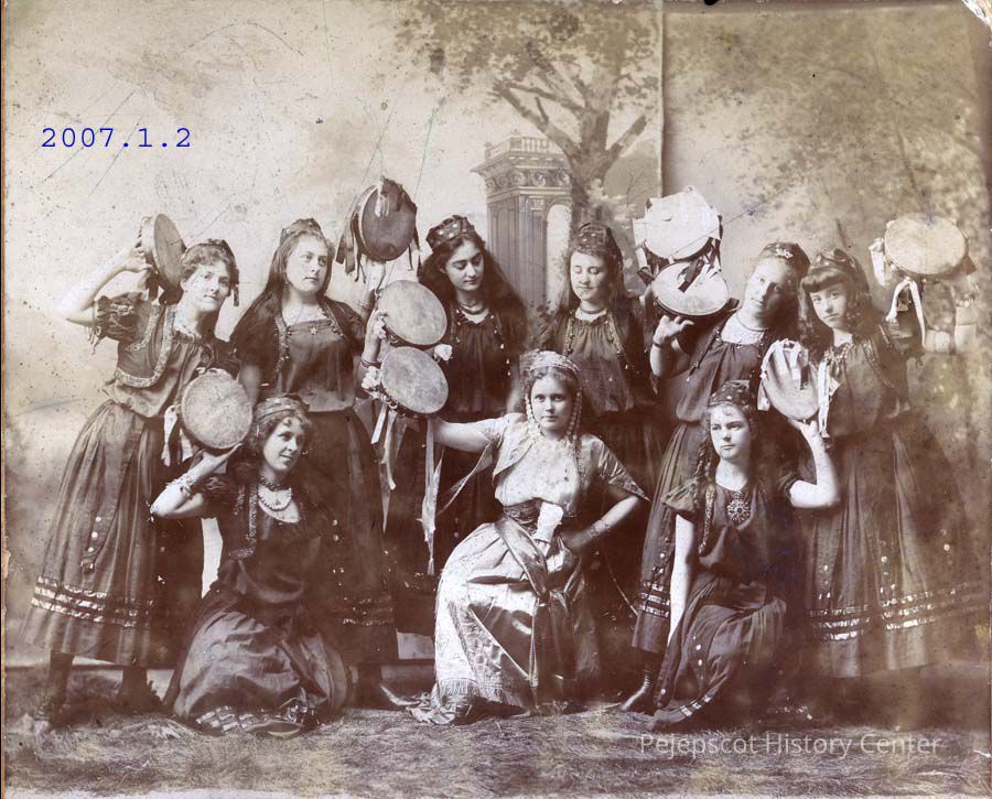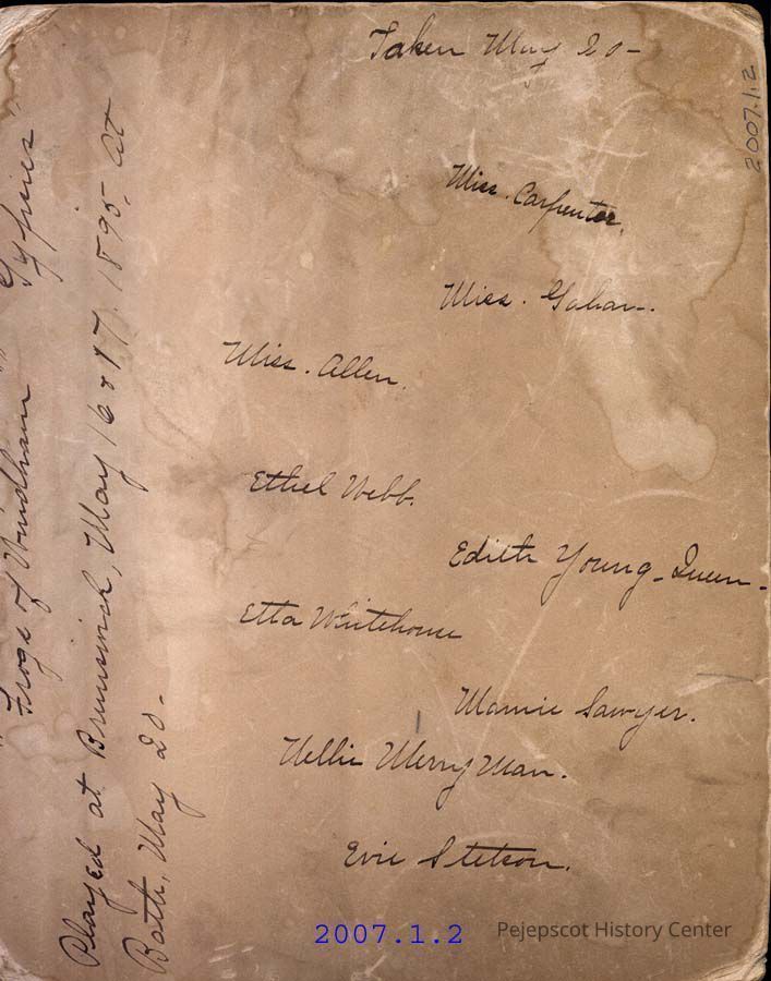 A B/W photograph of the cast of "Frogs of Windham" and "Gypsies." Played in Brunswick, May 16 & 17, 1895 and in Bath, May 20. The cast is identified on the back. Front row l to r: Miss Allen, Ethel Webb, Etta Whitehouse. Back row l to r: Miss Carpenter, Miss Gahan, Edith Young (Queen), Marnie Sawyer, Nellie Merryman, Evie Stetson. Photo taken May 20, 1895Lexicon