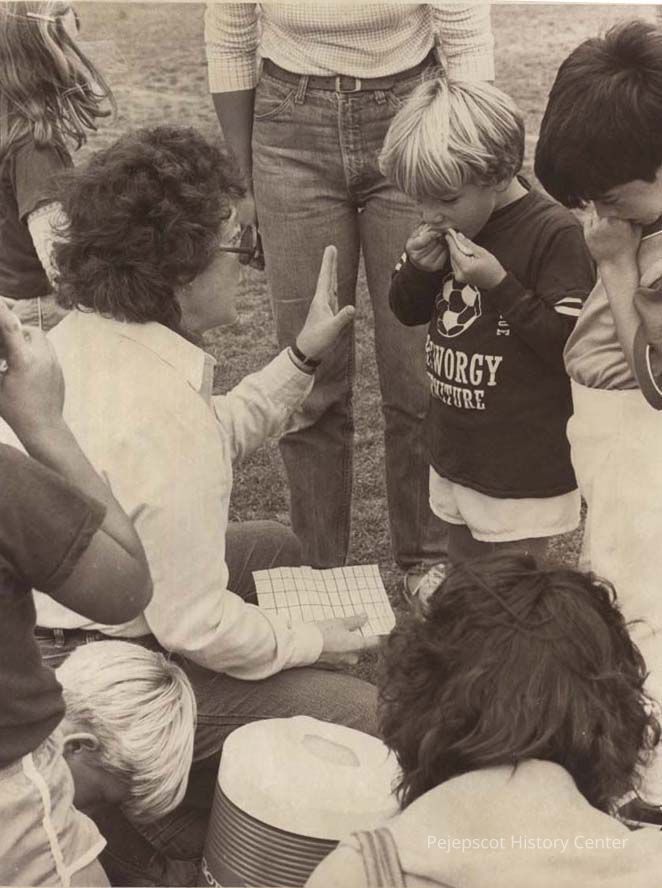 A B/W photographic view of Cecelia Sheridan giving a last minute pep talk to her soccer players. This photo was published 10/10/1983.