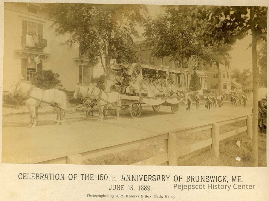 A sepia toned photograph of a parade for the 150th anniversary of Brunswick, on Park Row (the Skolfield-Whittier House can be seen in the background). The photo shows a wagon float drawn by four white horses. Riding on the float are several dozen people. Behind the float is a group of people marching in the parade. At the bottom is printed, "Photographed by J.C. Higgins & Son, Bath, Maine". Dated June 13, 1889.