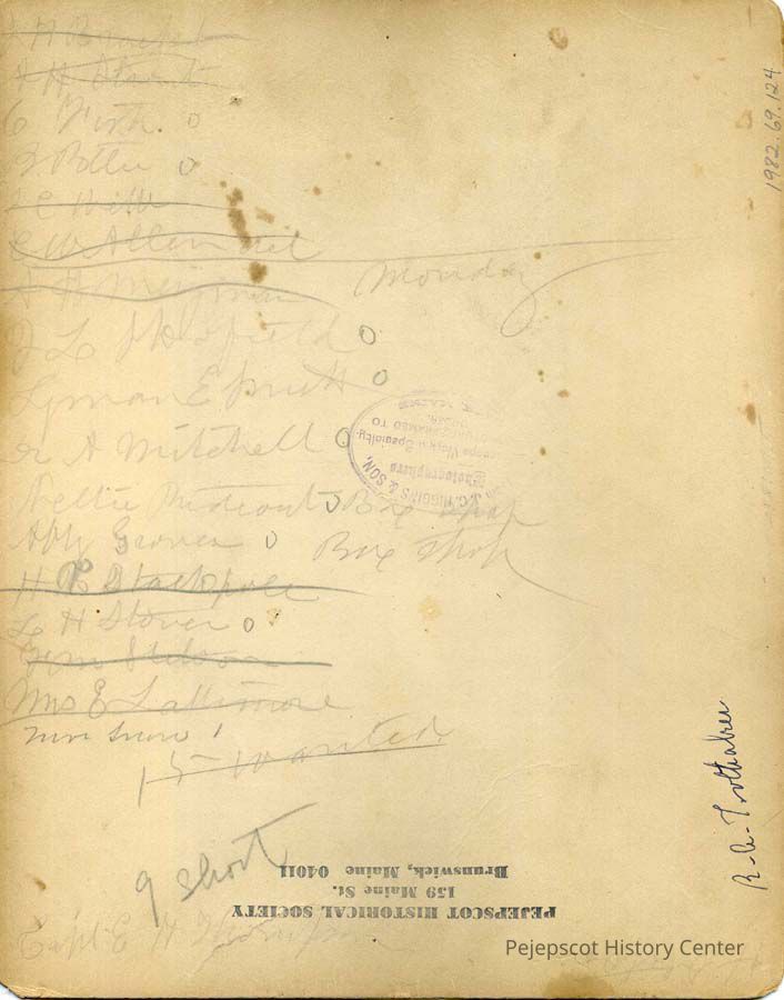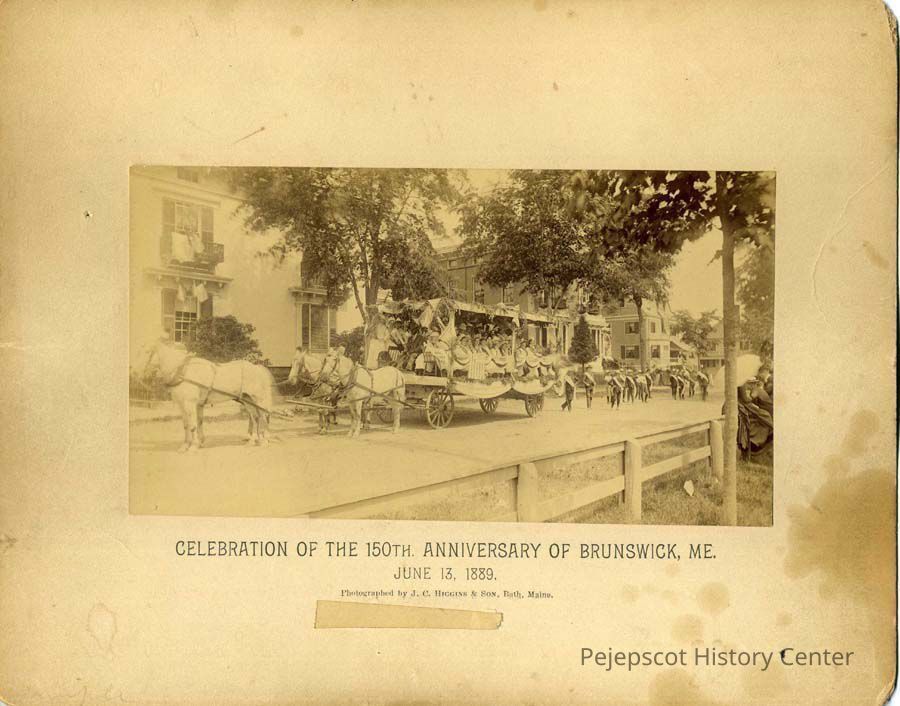 Black & white photograph of the celebration of the 150th anniversary of Brunswick showing a parade float. Skolfield-Whittier House is in background.