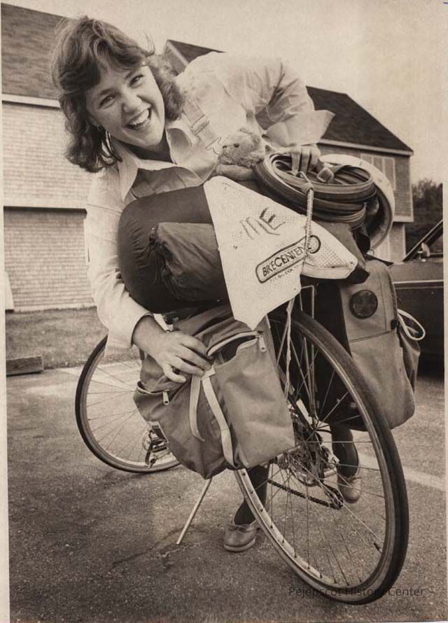 A black and white photo Celeste Gagnon of Brunswick was published in The Times Record in Brunswick, Maine on 9/22/1982 with an article on her coat-to-coast cycling trip.