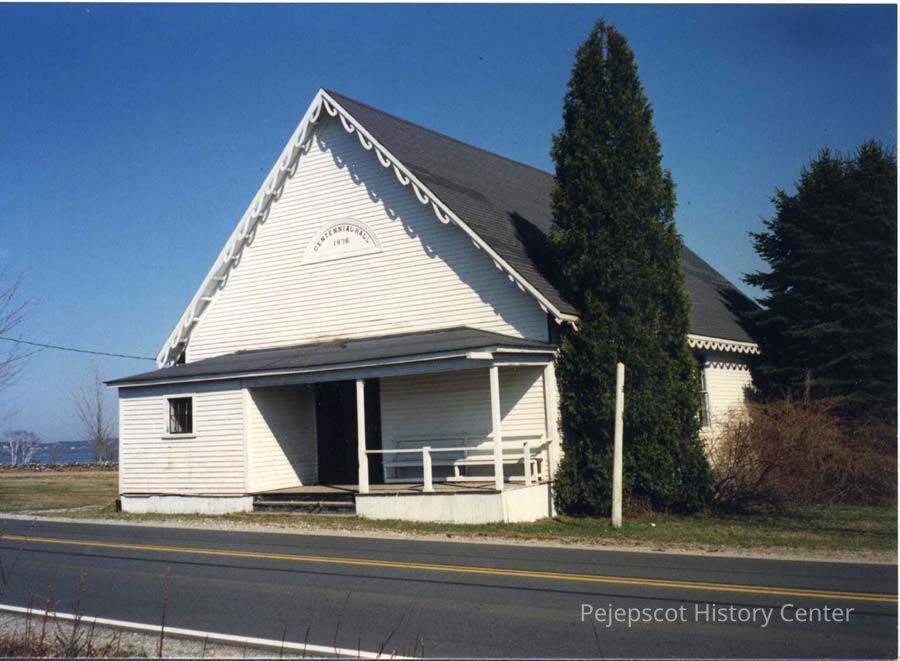A color photograph of Centennial Hall located on Route 123 in South Harpswell, Maine. Many of Forrest Orr's summer art shows were held in this building. Photo dated March 9, 1987.