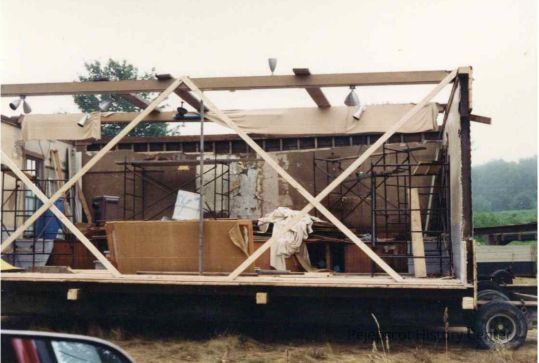 Part of Centennial Hall on a trailer with the side open. There is scaffolding and other construction material inside of the building. The trailer is sitting on grass. The photo was taken from a car, evidenced by the mirror in the bottom left corner.Collection