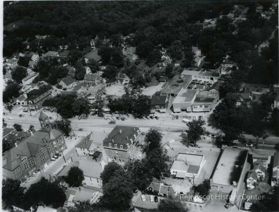 A b/w aerial photograph of center of Brunswick showing the Old Town Hall, stores on the eastern side of Maine Street and center parking on Maine Street. Undated