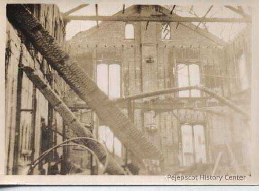 Photo of the Center Street School after a fire. The Center Street School was located at 17 Center Street, which in 2011 was the location of the Brunswick, Maine, Recreation Center.