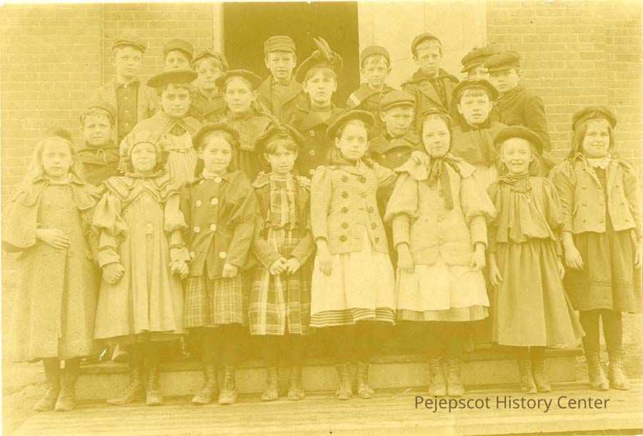 A yellow-hued photograph of children from the Center Street School in Brunswick, ME. Undated.