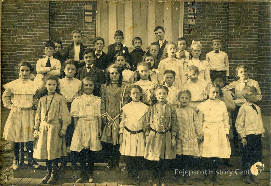 An undated black and white photo of children in front of the Center Street School of Brunswick, Maine.