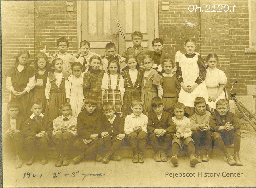 A B/W photograph of the second and third grade classes at Center Street School, Brunswick, ME. Dated 1907.