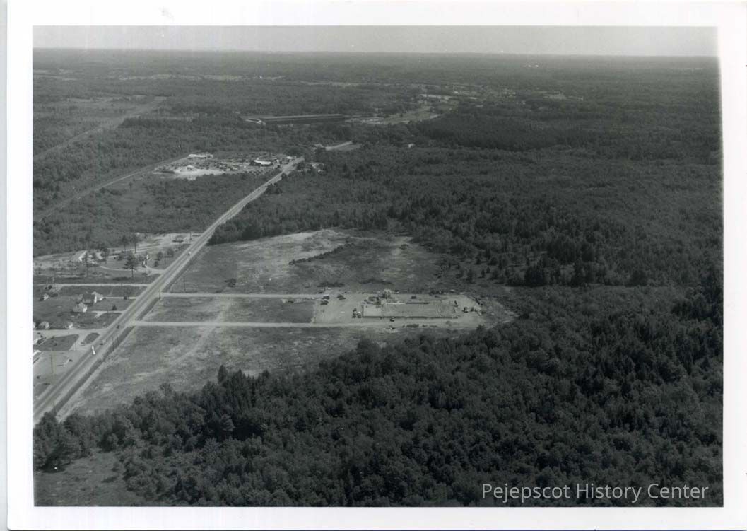 An aerial photo of Central Maine Power Company's building on Bath Road and showing the shopping center lot as well on August 13, 1956.