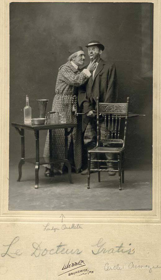 B/W photo of two men in costume for the Cercle Cremazie Dramatic Club. Ludger Ouellette on the left. Scene from a play, "Le Docteur Gratis".