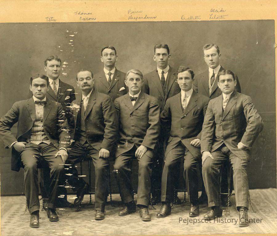 B/W photo of men, Ludger Ouellette 2nd from right, first row-? Henri Letarte end of back row on rt. Members of "Cercle Cremazie" -- Franco Americans. Some names on picture.