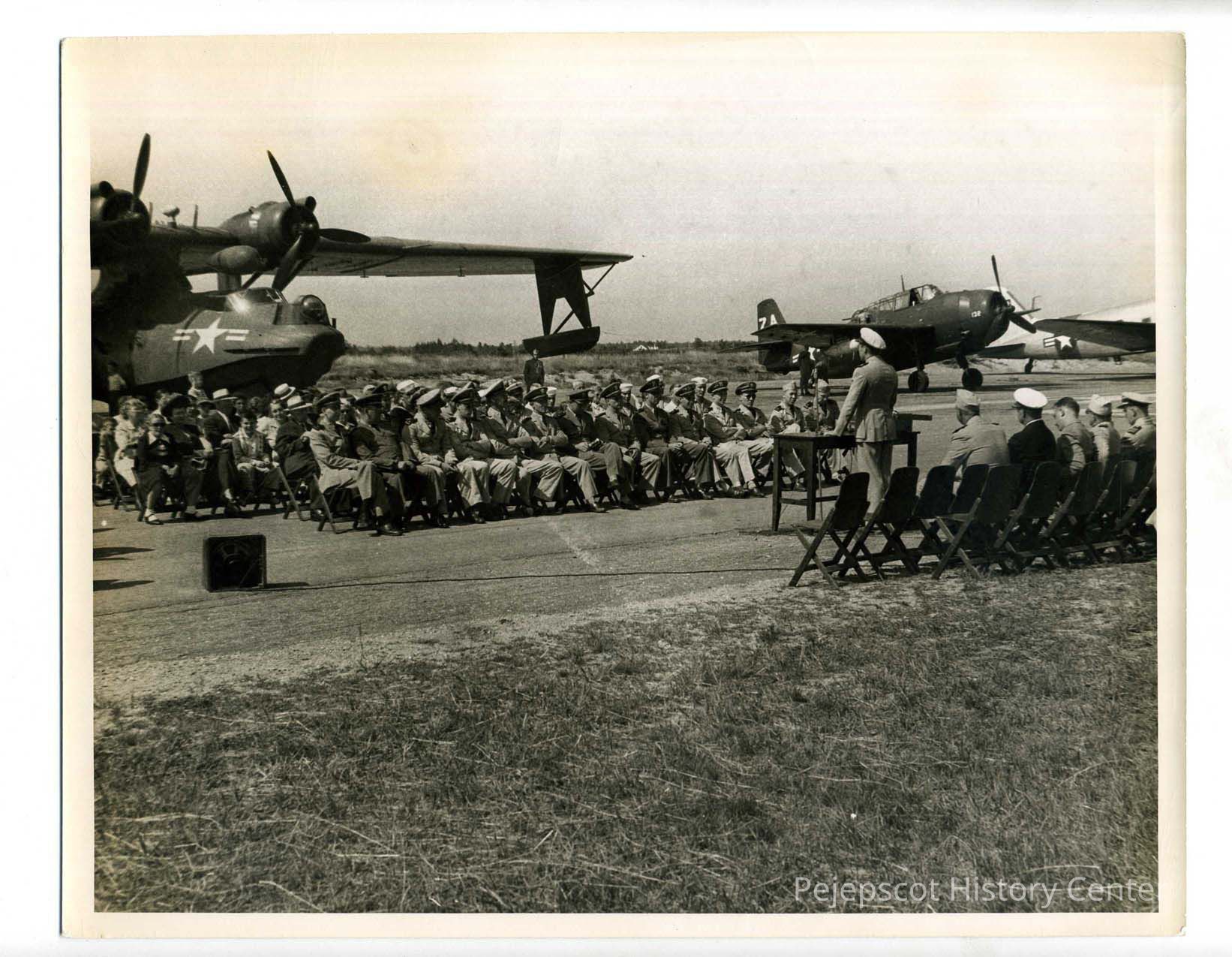 Several rows of people sit in folding chairs in front of three planes on the runway at BNAS. The front row is all Navy officers. In front of them is a table with a Navy speaker talking thru a microphone. In back of him are five Navy men. The back of the photo reads as follows, "BNAS late 1940s. R4D/C-47 DAKOTA, TBM ADVENGER, PBY-5C CATOLENA." Presumably this identified the three planes. Undated