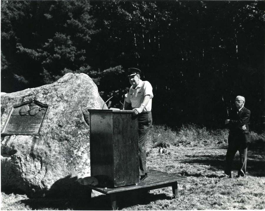 Photo of ceremony honoring 50th anniversary of "Around the World Flyers", 1974, at Mere Point Monument Rock, Brunswick, Maine. On left at podium is Brig. Gen. Paul, and on right is Paul Burbank.Lexicon