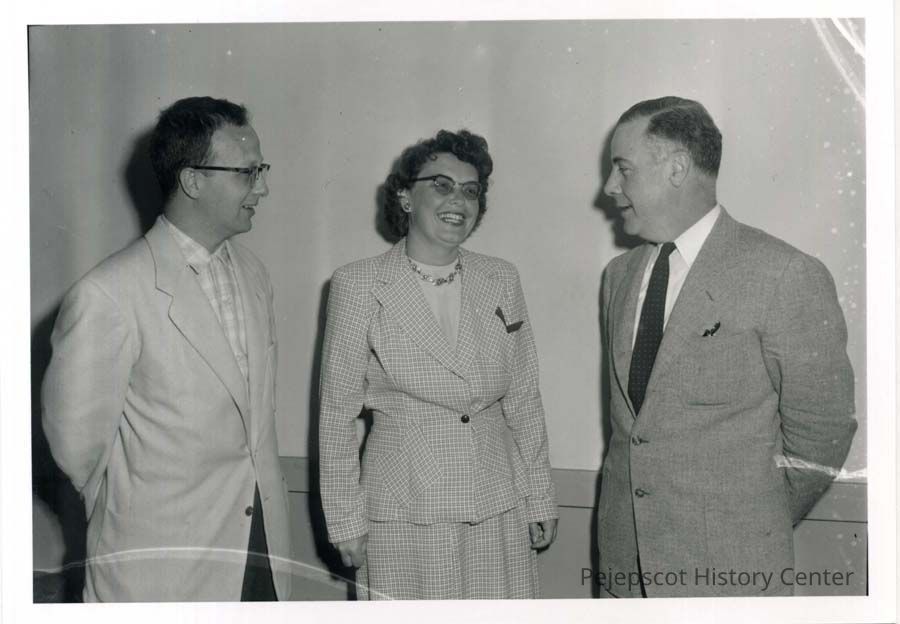 Black and white photograph of Chamber of Commerce - 6/1/55. Philmore Ross, Vice President, Mrs. Merle Norton, James E. Black, President.