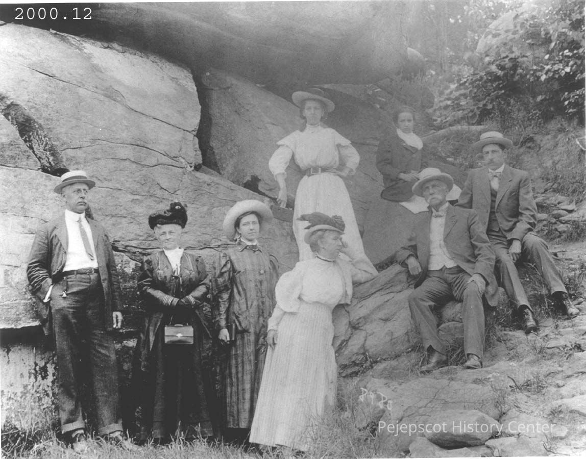 A sepia photo of the Chamberlain family at Devil's Den. The subjects are identified from left to right as: Horace Allen, unknown member of the Allen family (possibly Horace's mother), Eleanor Allen, Grace Allen (leaning on rock and facing the right), Beatrice Allen (behind Grace), Rosamond Allen (behind Joshua Chamberlain), Joshua L. Chamberlain, and Harold Wyllys Chamberlain. Possibly 1909.Lexicon