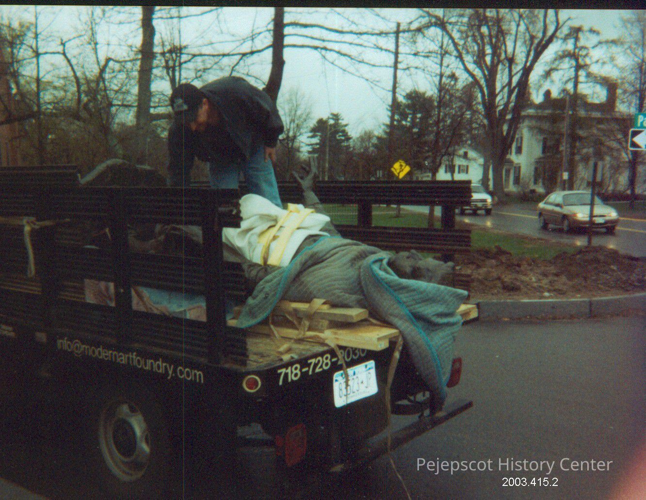 A color photograph of the Joshua L. Chamberlain statue in the back of a truck on Maine Street in Brunswick, Maine, on 5/9/2003.