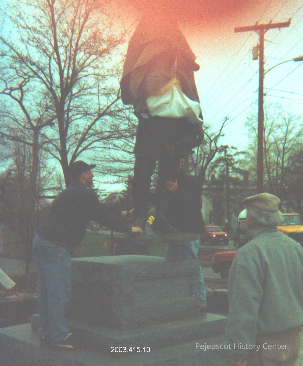 A color photograph of the Joshua L. Chamberlain Statue being placed on its pedestal. The sculptor Joseph Query is holding the statue's feet.The photo was taken on 5/9/2003 in Brunswick, Maine.