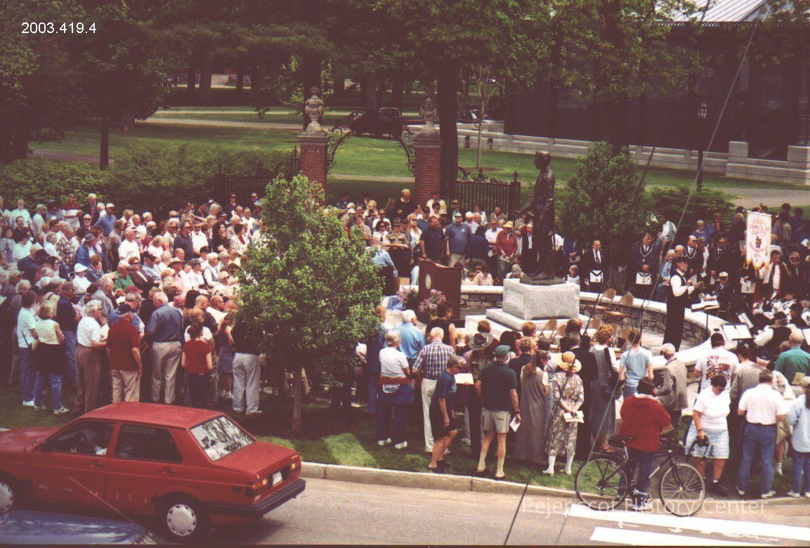 A color photograph of the crowd at the Joshua L. Chamberlain statue at the dedication. The photo was taken from the front balcony of the Chamberlain House in Brunswick, Maine, on 5/31/2003.