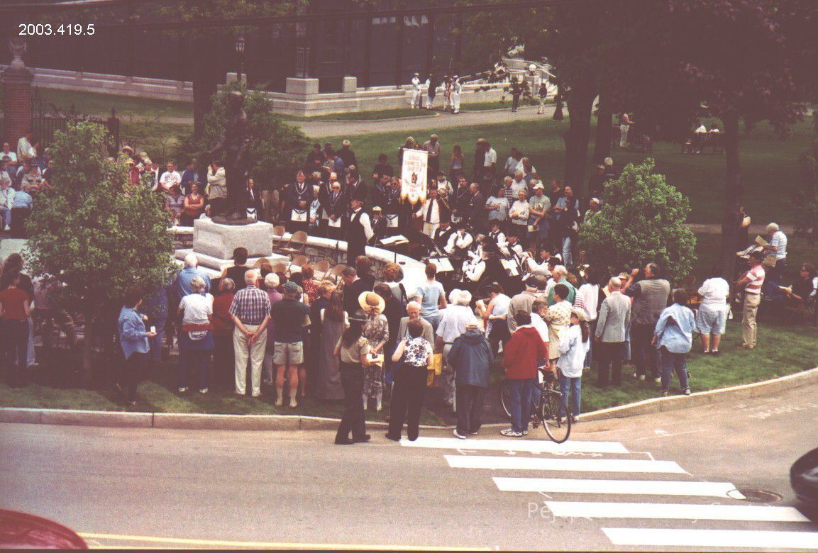 A color photograph of the crowd at the Joshua L. Chamberlain statue at the dedication. The photo was taken from the front balcony of the Chamberlain House in Brunswick, Maine, on 5/31/2003.