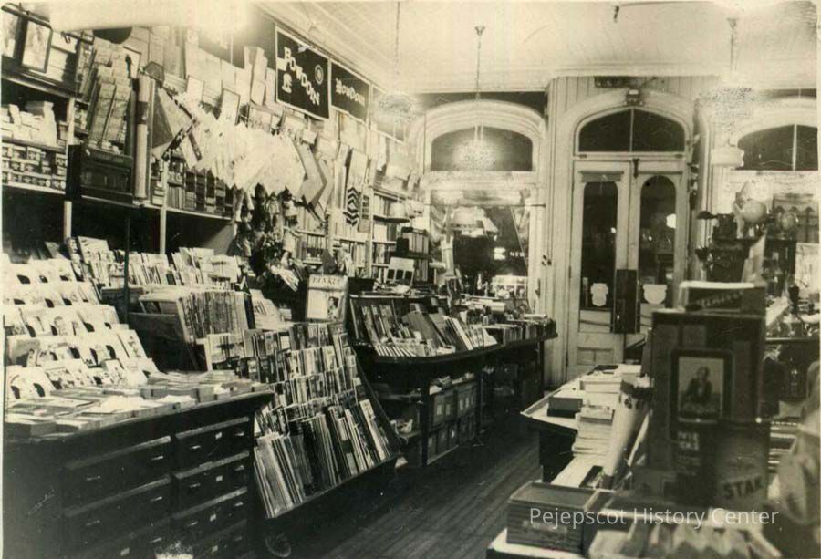 An undated black and white photograph of the interior of Chandler's Book Store at the corner of Pleasant and Maine Streets, Brunswick (in the current Lemont Block building).
