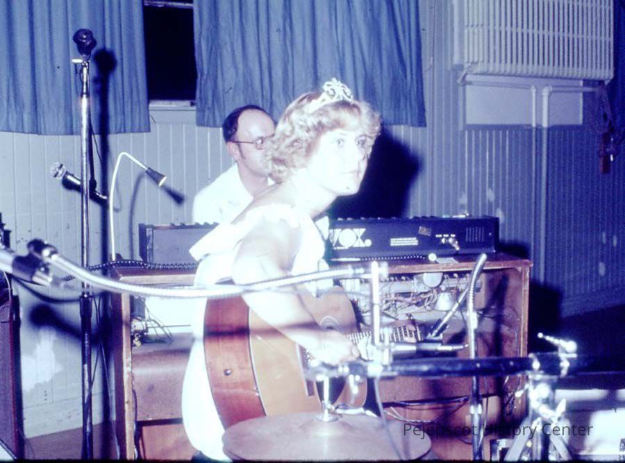 A 35 mm color slide of a contestant in the Miss Teen Queen Pageant. Chanel Fortin is playing the organ in the background. The slide is marked, "14" and "Jul 77."