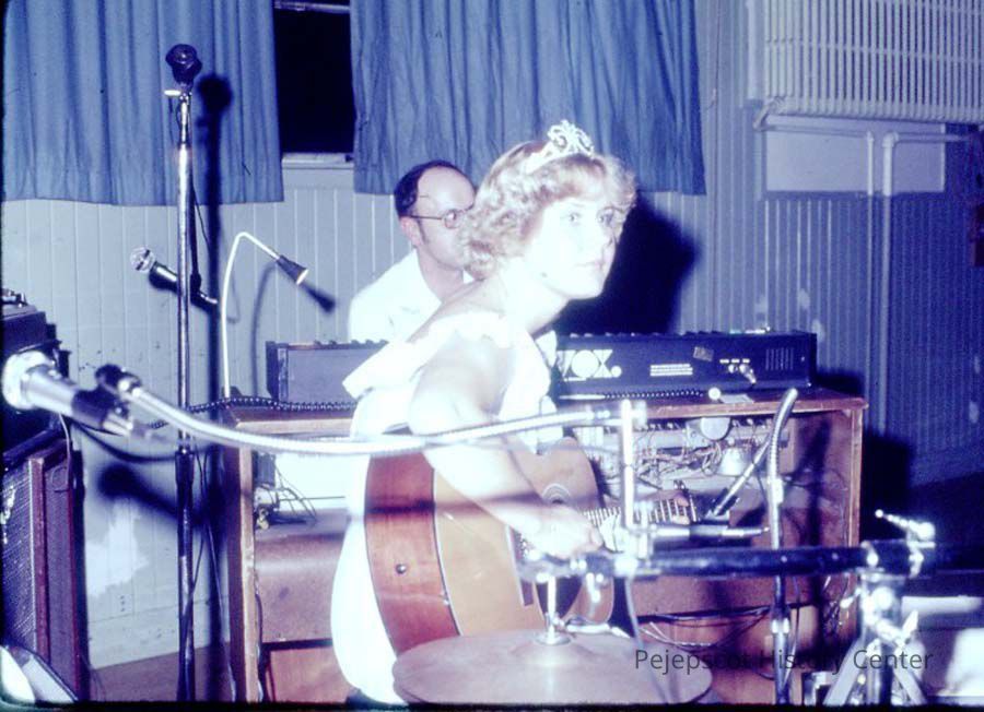 A 35 mm color slide of a contestant in the Miss Teen Queen Pageant. Chanel Fortin is playing the organ in the background. The slide is marked, "14" and "Jul 77."