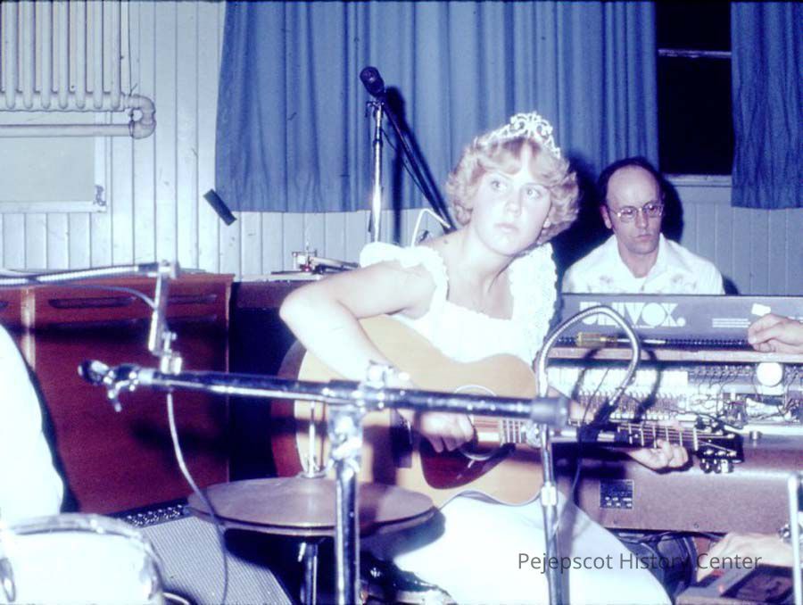 A 35 mm color slide of a contestant in the Miss Teen Queen Pageant. Chanel Fortin is playing the organ in the background. The slide is marked, "!!" and "Jul 77."