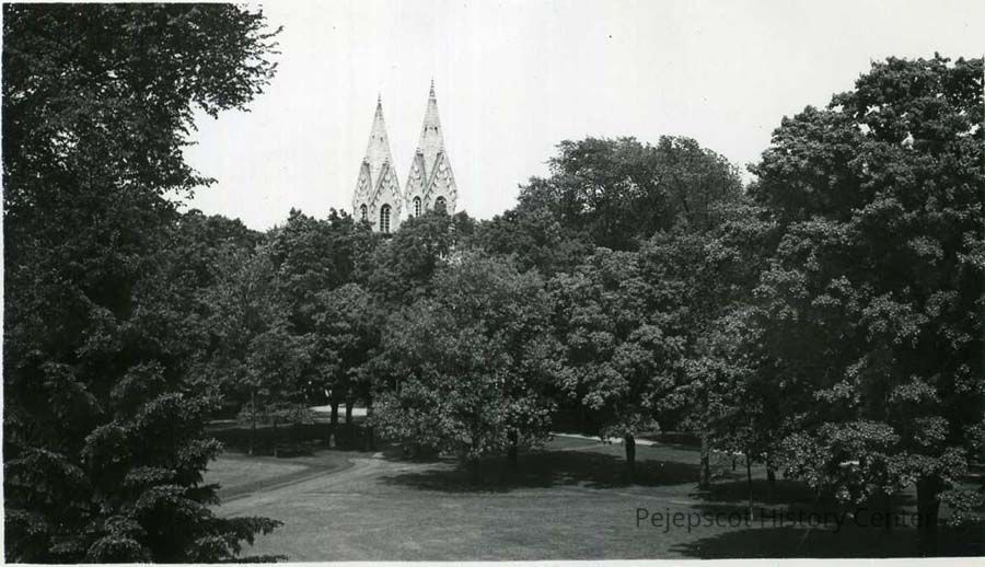 B/W photo of the Chapel Spires of Bowdoin College from a window in Hubbard Hall, June 7, 1946.