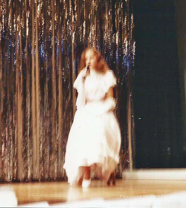A color photograph of Charity Edwards singing for her talent presentation.