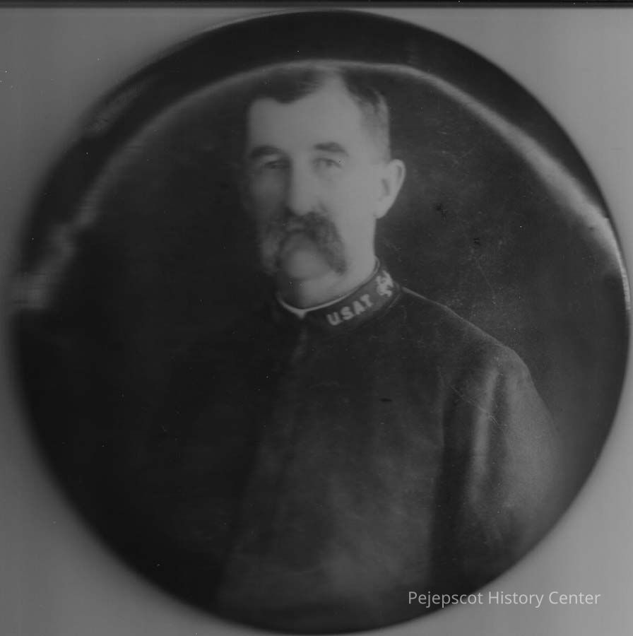 A B/W photograph of Charles A. Rogers of Topsham, in uniform. On his collar is U.S.A.T. (United States Army Transfer). The photo is printed on a metal disk, round. Undated
