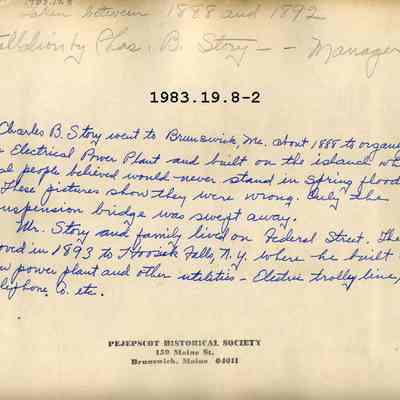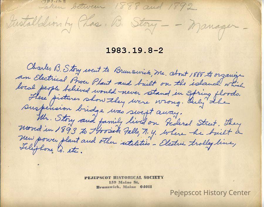 Marked on the back, "Installation by Charles B. Story, manager. Charles B. Story went to Brunswick, Me about 1888 to organize an Electric Power Plant and built on the island which local people believed would never stand in Spring Floods"