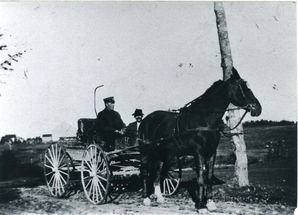 An undated black and white photograph of Charles D. Stover driving the mail in a cart pulled by a horse named "Dan," talking with Scott Allen who is standing on the road, based on information written on the back of the photo.