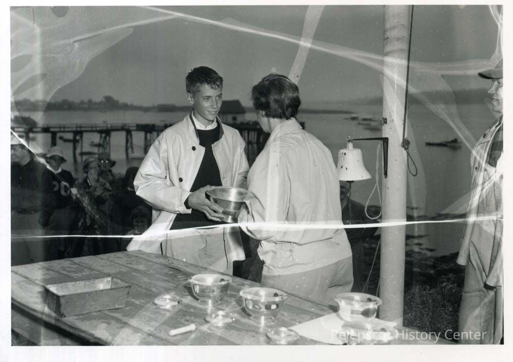 Charles Emerson who raced and won in the turnabout category for the Portland Yatch Club. Here he is shown accepting the Gannet Trophy on July 22, 1956 for his club.
