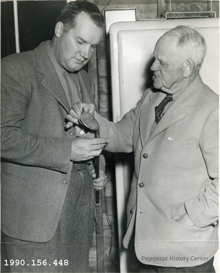A B/W photograph of Charles ("Pop") Erswell grand old Mr. Golf, shows Jim Browning Brunswick Golf Club's new pro, the first wedgie golf club ever made. A homemade affair, the club is now outlawed in golf. UndatedCollection