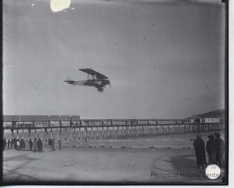 Photo of Charles Lindbergh landing his airplane at Old Orchard Beach.