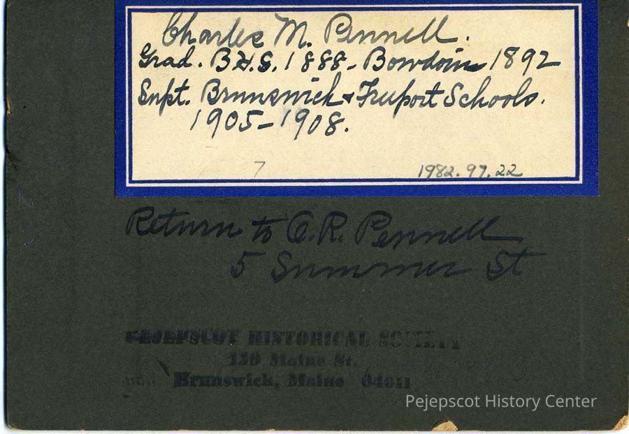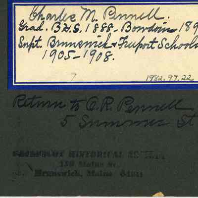 Charles M. Pennell, Brunswick High School Class of 1888, Bowdoin 1892,. Sepia photograph on black mat of Back reads: "Charlie M. Pennell, Grad. of Brunswick High School Class of 1888, Bowdoin 1892, Supt. Brunswick & Freeport Schools 1905-1908. Return to A.R. Pennell, 5 Summer St."Lexicon