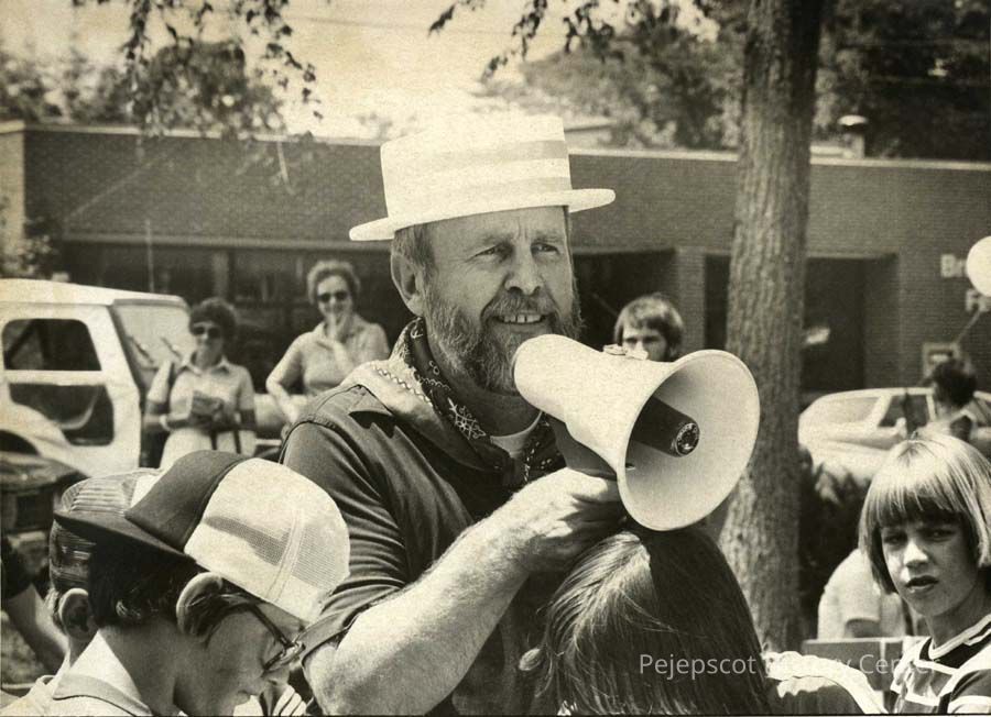 A black and white photograph of Charles (Bill) Pettigrew of Topsham directing children's games on the Brunswick Mall appeared in The Times Record in Brunswick, Maine, on 7/14/1980.