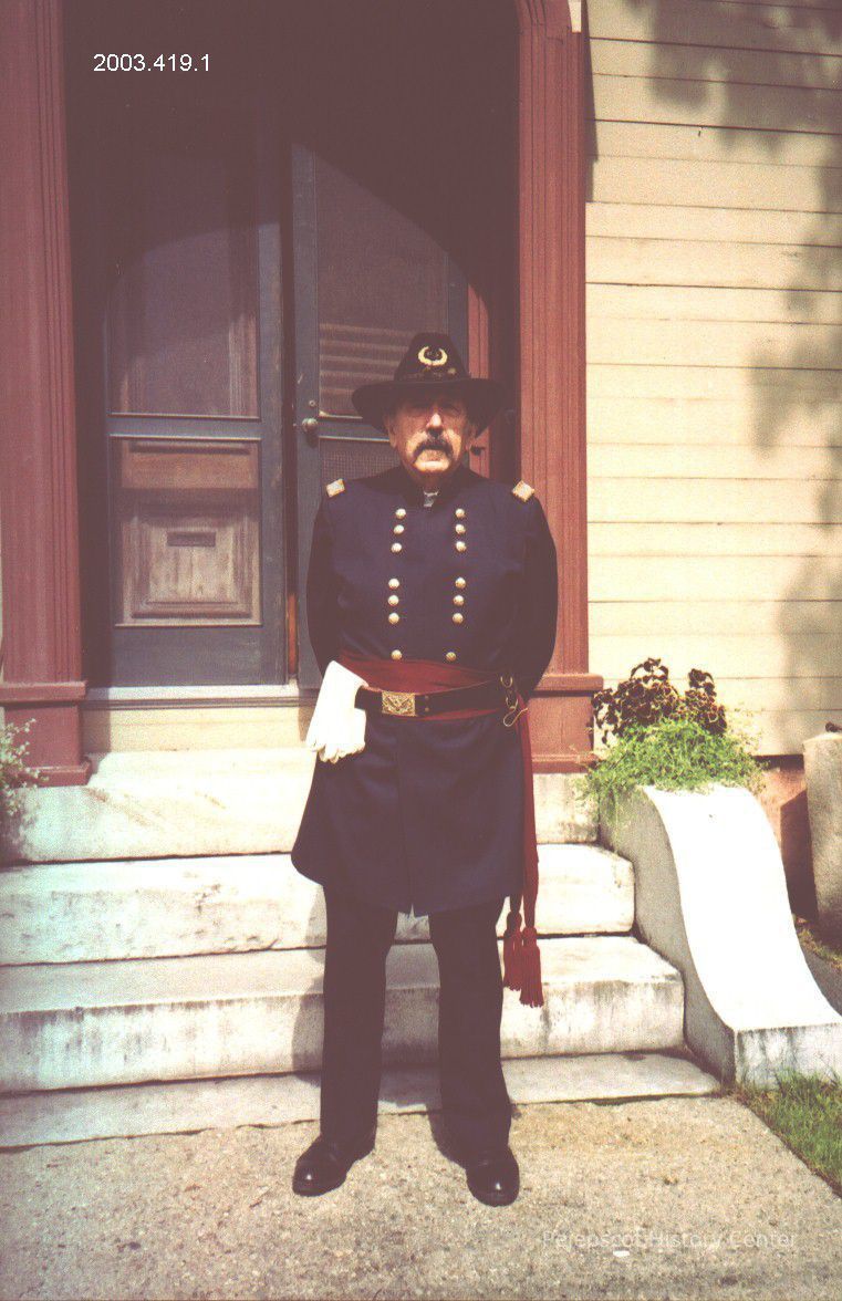 A color photograph of Charles Plummer dressed as Joshua Chamberlain was taken in front of the Chamberlain Museum in Brunswick, Maine, on 5/31/2003, the day the Chamberlain statue was dedicated.