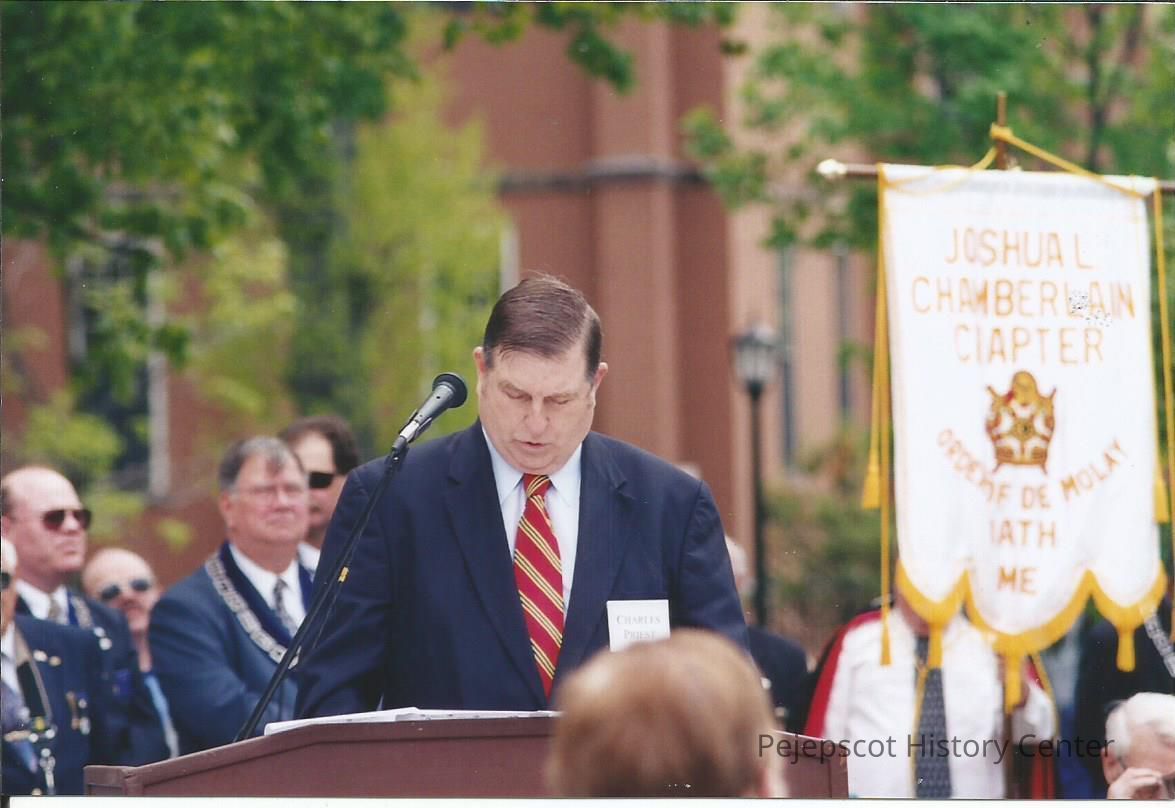 A color photograph of Charles Priest speaking at the Joshua L. Chamberlain statue dedication in Brunswick, ME. Dated 05/31/2003.