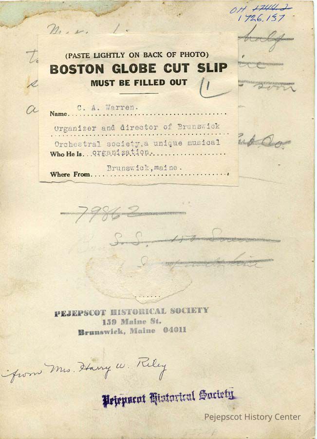 A B/W photograph of Charles S. Warren, director of the Brunswick Orchestra. Brunswick, ME. Not dated.