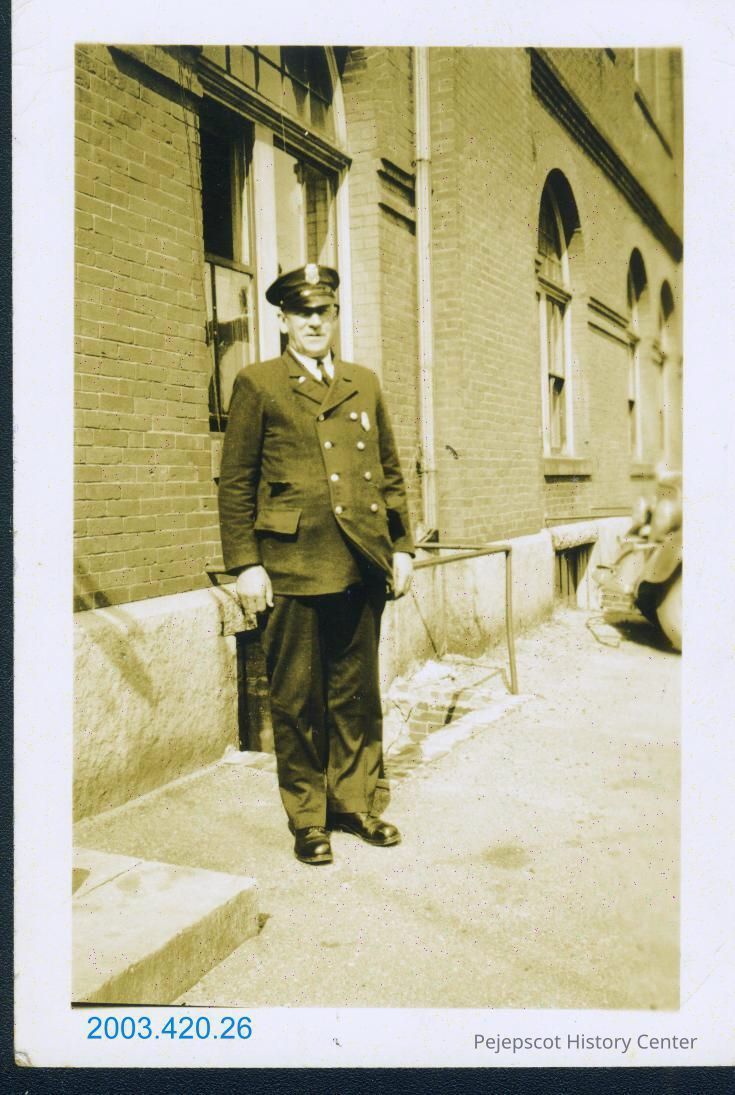 A black and white photograph of Brunswick, Maine, Police Officer Charlie Jordan was taken n front of the Brunswick Town Hall on 4/23/1939.